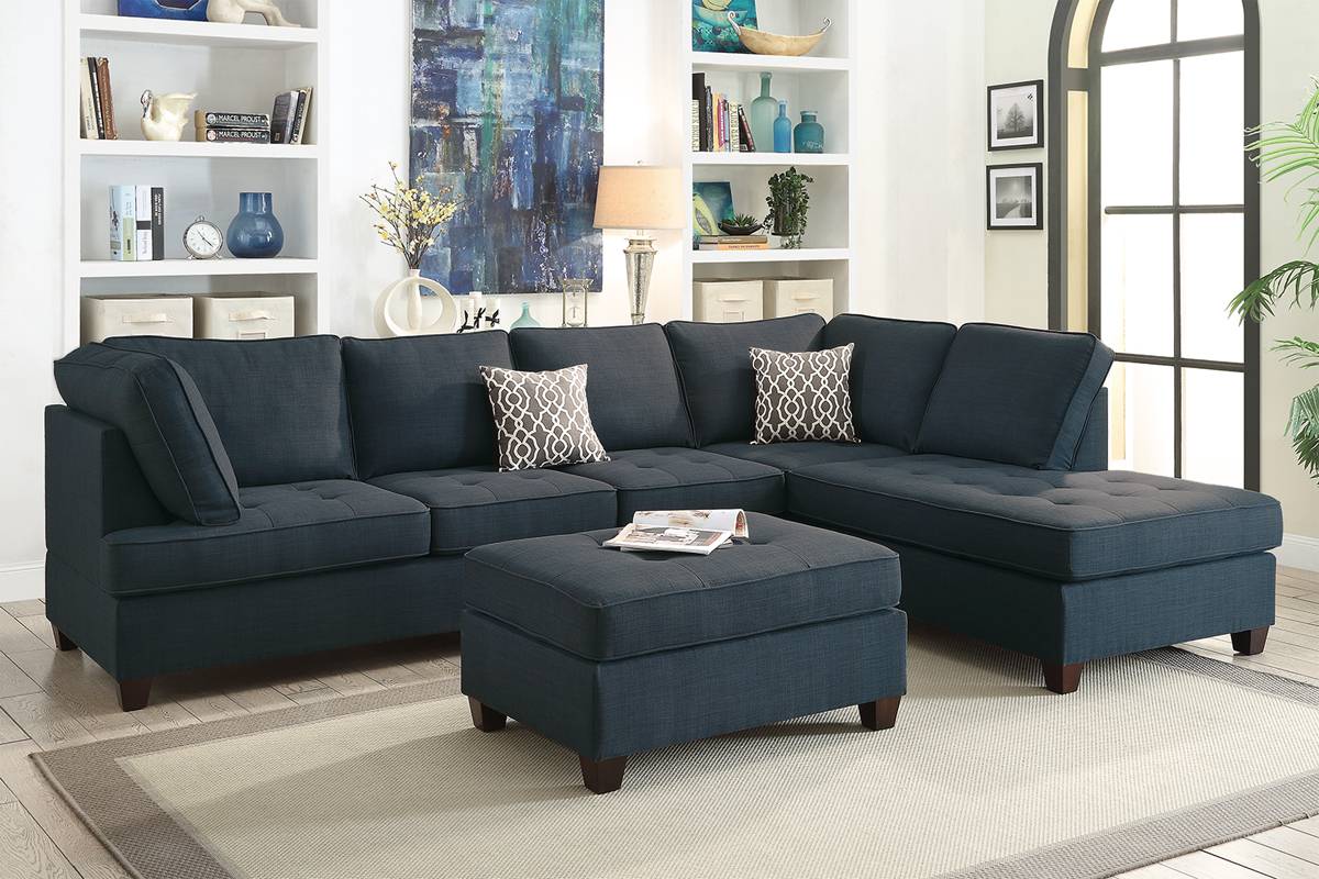 Elevate your living space with our Sectional Sofa. Featuring luxurious tufted seat cushions and accent pillows, this 2-piece set will provide both style and comfort. Available in Ash Black or Dark Blue (Dorris Fabric), with a matching Ottoman (F6993) available for separate purchase. Upgrade your home today.