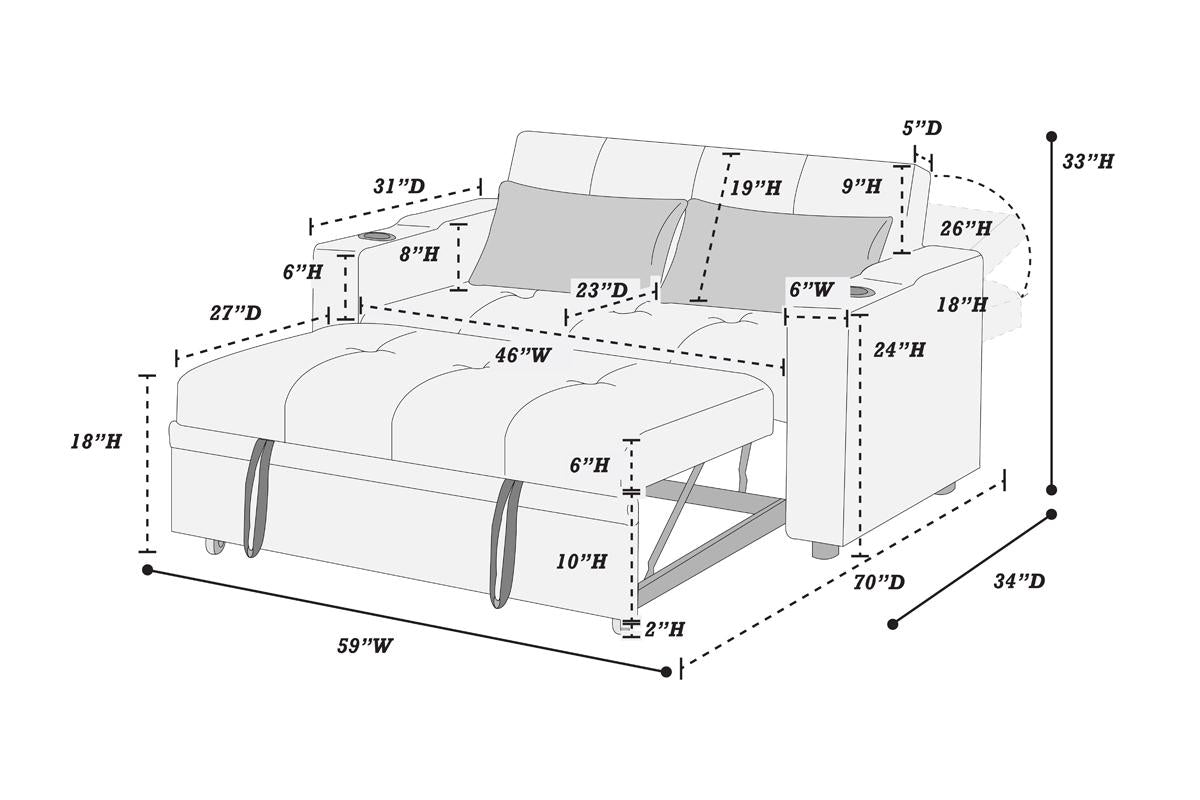 Crafted with precision and adorned with premium features, this convertible sofa is more than just a piece of furniture; it's a lifestyle upgrade. Embrace the convenient design of the square arms equipped with built-in cupholders. Now you can enjoy your favorite beverages without the need for additional tables. Experience customizable comfort with the adjustable backrest that effortlessly lifts up or down. Whether you're lounging or sitting upright, our sofa adapts to your preferred seating position. Transform your space in an instant with the easy-to-use pulling handle that extends the sofa into a comfortable pull-out bed. Perfect for accommodating overnight guests or creating a cozy spot for movie nights. Two small accent pillows are included, providing additional support and a cohesive aesthetic.
