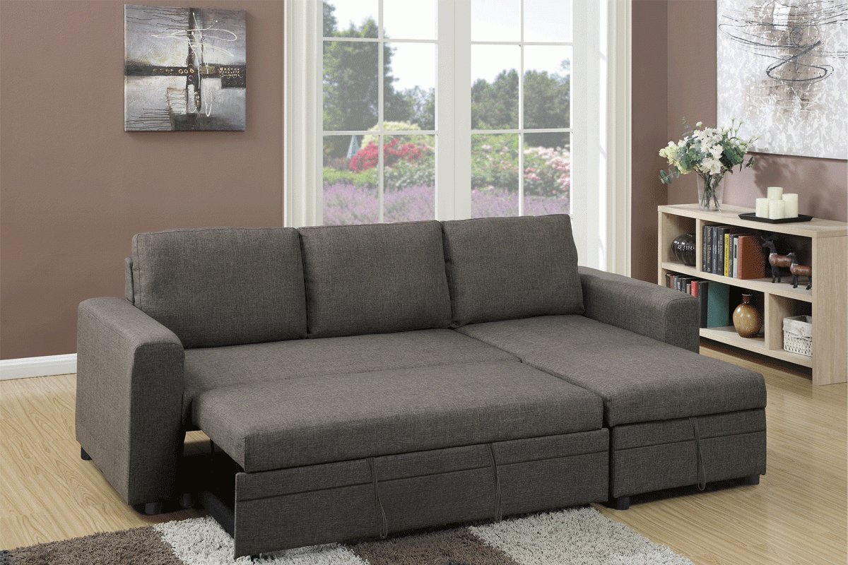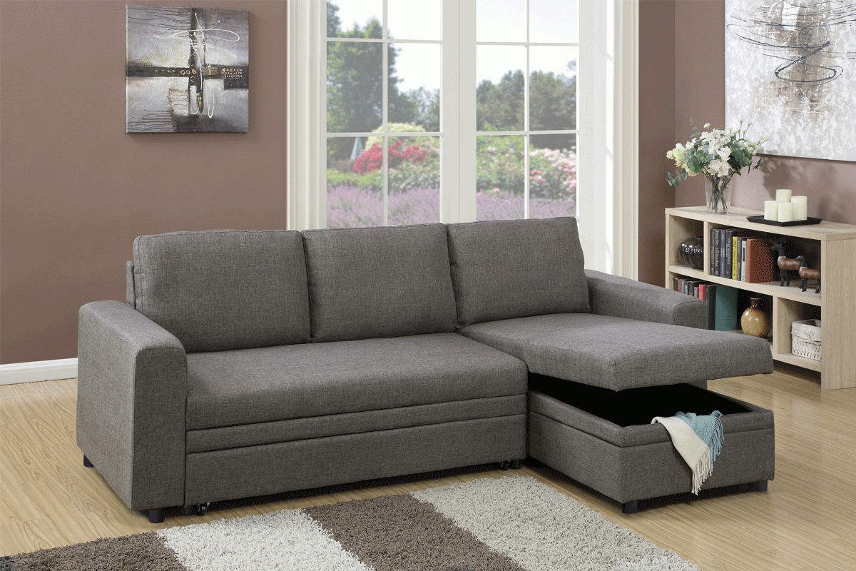 Relax, entertain, and rest on this 2-piece sectional with a simple design to fit a variety of living room styles. This unit features a modular structure covered in polyfiber with a pullout bed and a functional lower storage compartment. Available in blue grey, light coffee, and carmine.