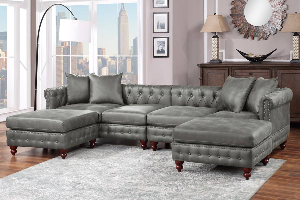 This four pieces chaise and ottoman set is beautifully crafted with breathable leatherette upholstery. This spacious sofa set can host a good amount of guests, and the cocktail ottoman can serve as a foot rest or a place to put soft drinks or coffee for your guests. Supported by the hand crafted wooden legs, this elegant sofa set comes in dark grey and slate grey that can match any home decorations.