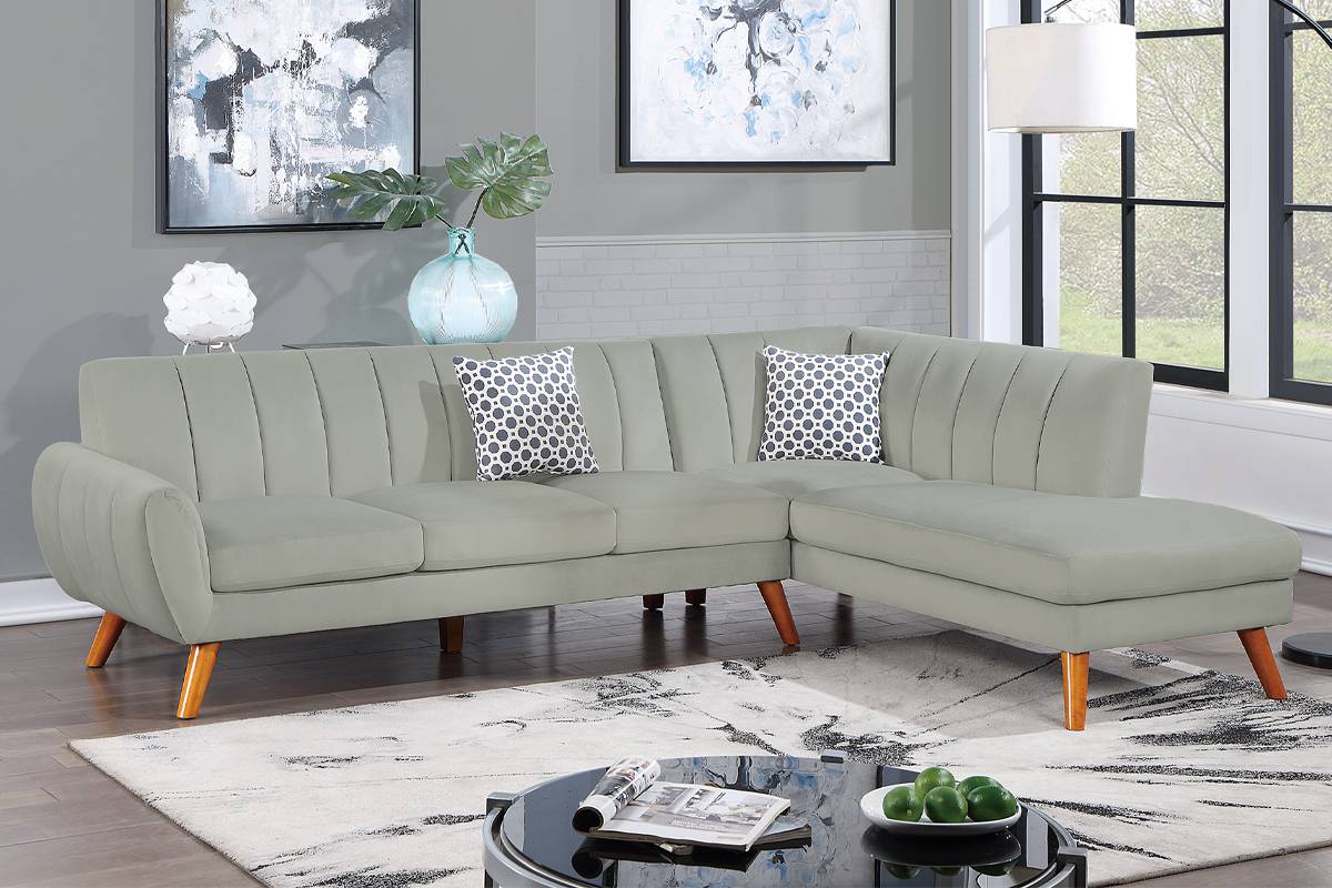 Its vintage charm and style are unmatched, which delivers this 2-piece sectional sofa brightening any living space. With clean vertical lines of accent tufting on the back cushion, firm seating, and a curved armrest, entertaining guests' is a piece of cake. This set includes a right-facing chaise and a left-facing sofa, and short wooden angled legs. Upholstered with velvety smooth fabric, this set is available in Dark Gray, Light Brown, and Light Gray.